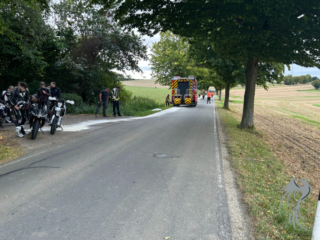 Vor Ort bestätigte sich die gemeldete Lage. An einem Motorrad entstand aus bisher unbekannter Ursache ein Defekt an dem Motor, wodurch eine große Menge Öl austrat. Auf einer länge von rund 400 Metern streuten die Einsatzkräfte der Feuerwehr den betroffenen Bereich mit Ölbindemittel ab. Im Anschluss wurde das kontaminierte Bindemittel zur fachgerechten Entsorgung wieder aufgenommen.