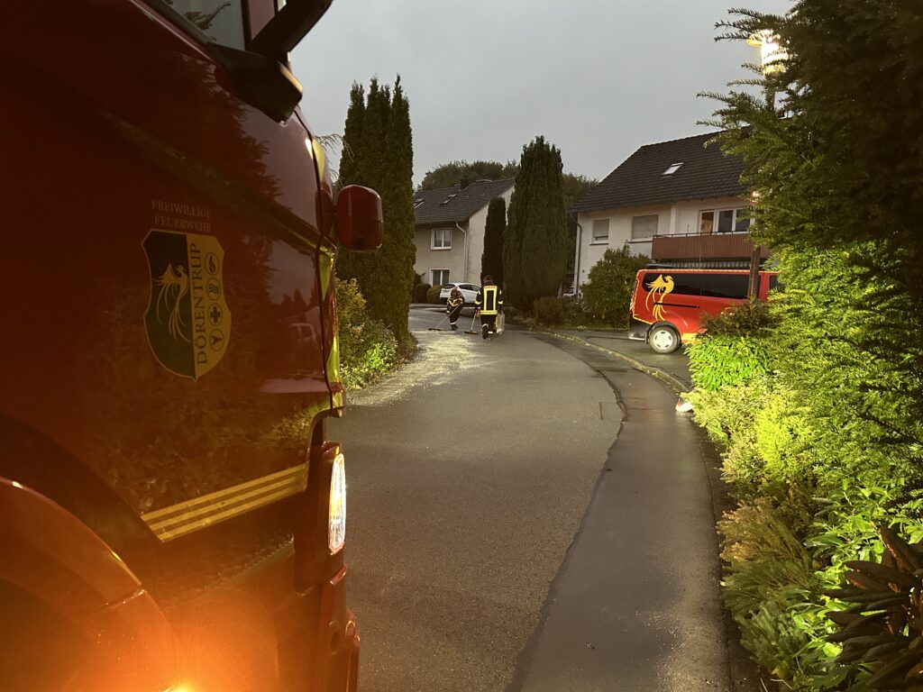 Mit dem Einsatzstichwort „Erkundung Ölspur“ wurde die Feuerwehr Dörentrup am Montagabend zu einem Verbrauchermarkt im Zentrum von Dörentrup alarmiert.