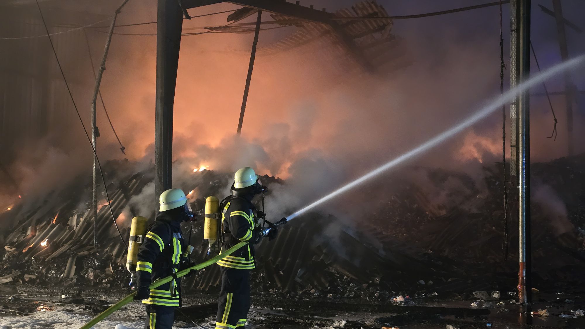 Beim Eintreffen der ersten Einsatzkräfte stand bereits ein erheblicher Bereich des rund 125 x 30 Meter großen Gebäudekomplexes in Vollbrand. Durch die enorme Hitzeentwicklung stürzten Teile des Daches ein. Das Industriegebiet wurde großräumig abgesperrt, während gleichzeitig eine Riegelstellung über mehrere Seiten errichtet wurde, um ein Übergreifen der Flammen auf angrenzende Hallenteile zu verhindern.