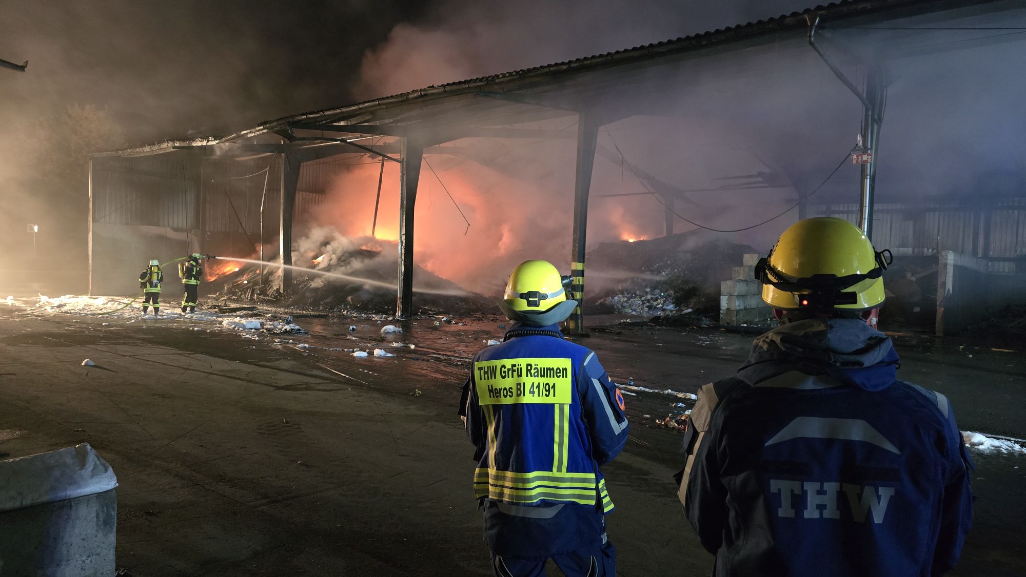 Da sich die Glutnester tief in den über 120 Tonnen Unrat befanden, wurde das Technische Hilfswerk (THW) mit 2 Radladern und weiterem schwerem Gerät hinzugezogen, um das Material auseinanderzuziehen und gezielt ablöschen zu können.