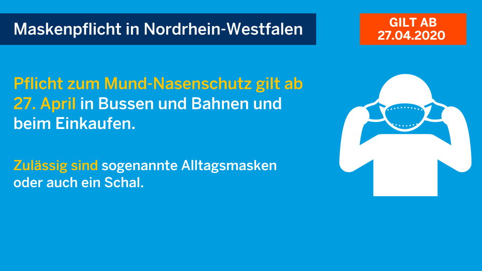 Heute wurde beschlossen, dass ab Montag den 27.04.2020 die Maskenpflicht in den Bussen und Bahnen, sowie beim Einkauf in Kraft tritt.